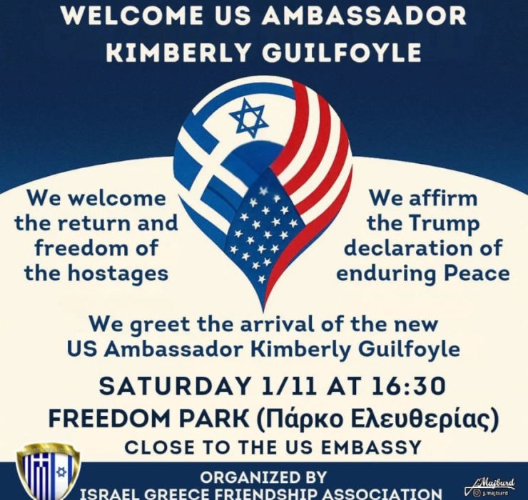 Με μήνυμα ενότητας, ειρήνης και διπλωματικής συνέχειας, το Israel-Greece Friendship Association, διοργανώνει στις 1 Νοεμβρίου, στις 16:30, εκδήλωση-συγκέντρωση στο Πάρκο Ελευθερίας, πλησίον της Αμερικανικής Πρεσβείας.