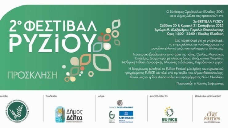 Το φεστιβάλ, που διοργανώνεται από τον Σύνδεσμο Ορυζομύλων Ελλάδος (ΣΟΕ) σε συνεργασία με τους Δήμους Δέλτα και Θεσσαλονίκης, θα διαρκέσει από τις 14:00 έως τις 22:00.