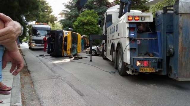 Σχολικό λεωφορείο συγκρούστηκε με δύο ΙΧ και ανετράπη στη συμβολή των οδών Θερμοπυλών και Μπακογιάννη στα Βριλήσσια.