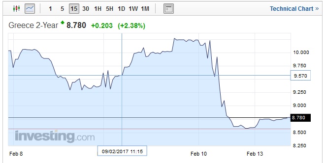 Η μεταβλητότητα είναι εντονότερη στην αγορά μεσοβραχυχρόνιων κρατικών χρεογράφων, με αντιπροσωπευτικότερη περίπτωση το διετές ομόλογο: Η απόδοση του εκτινάχθηκε την Παρασκευή στο 10,24%, υποχώρησε στο 8,58% όταν ξεκίνησε η διάσκεψη στις Βρυξέλλες με Ντάισελμπλουμ-Τσακαλώτο-Τόμσεν. Σήμερα ανεβαίνει πάλι κατά 40 μονάδες βάσης και διαμορφώνεται αυτή την ώρα σε 8,98% (δες κάτω γράφημα).