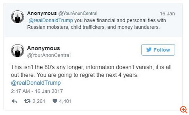 "Δεν είμαστε στη δεκαετία του '80 για να χαθούν οι πληροφορίες. Πλέον όλα γίνονται γνωστά. Θα μετανιώσεις τα επόμενα τέσσερα χρόνια" ανέφεραν οι Anonymous σε ένα από τα μηνύματά τους στον Tραμπ.