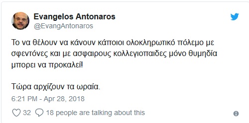 «Το να θέλουν να κάνουν κάποιοι ολοκληρωτικό πόλεμο με σφεντόνες και με άσφαιρους κολλεγιόπαιδες μόνο θυμηδία μπορεί να προκαλεί! Τώρα αρχίζουν τα ωραία».