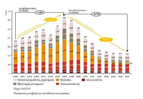 2. Καθίζηση του κατασκευαστικού τομέα που προέρχεται κυρίως από την αγορά κατοικίας αφού από το 2007 έως το 2016 οι επενδύσεις σε κατοικίες σημείωσαν πτώση 96%