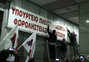 Σε υπουργείο «Πλειστηριασμών-Φοροληστείας και Χαρατσιών» μετονόμασαν το υπουργείο Οικονομικών μέλη του ΠΑΜΕ.Εργαζόμενοι του ιδιωτικού και του δημόσιου τομέα που ανήκουν σε σωματεία...