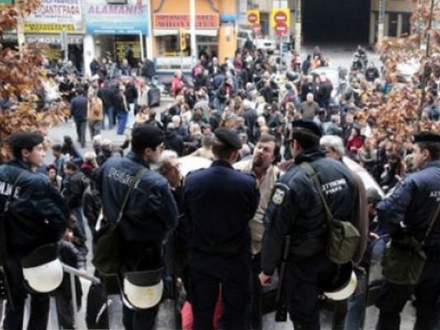 Μάλιστα οι άνθρωποι που διαμαρτύρονταν ενάντια στους πλειστηριασμούς, βρήκαν μπροστά τους δυνάμεις των ΜΑΤ, εντός του κτιρίου, αναφέροντας χαρακτηριστικα πως "η κυβέρνηση ΣΥΡΙΖΑ-ΑΝΕΛ αναβαθμίζει την καταστολή στέλνοντας τα ΜΑΤ στα δικαστήρια" και παράλληλα δεν τους άφησαν να μπουν στην αίθουσα, όπου εκείνη την ώρα λάμβανε χώρα πλειστηριασμός.