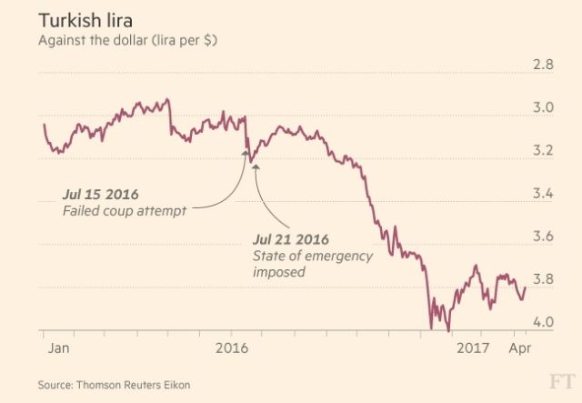 Δεν είναι λίγα τα στελέχη και οι επιχειρηματίες που έχουν πληγεί στην γειτονική Τουρκία. Τα αρνητικά σημάδια στην οικονομία και σε βασικούς κλάδους της είναι σαφή ενώ ενδεικτική είναι και η πορεία της λίρας όλο αυτό το διάστημα. Αν οι Τούρκοι απορρίψουν το σχέδιο που ετοιμάζει εδώ και καιρό ο Ταγίπ Ερντογάν για την αύξηση των εξουσιών του μέσω της δημιουργίας μιας εκτελεστικής προεδρίας, υπάρχει ο κίνδυνος ενός νέου κύματος αβεβαιότητας και αναταραχής στις αγορές. «Αν το αποτέλεσμα είναι “όχι”, προβλέπω μια μακρά περίοδο πολιτικής αναταραχής στην Τουρκία που θα καταλήξει σε πρόωρες εκλογές, τις οποίες το AKP μπορεί να κερδίσει ή να χάσει» εκτίμησε ο Ατίλα Γεσιλάντα, αναλυτής στη GlobalSourcePartners.