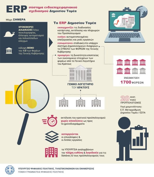 Επιπλέον, ο Υπουργός Ψηφιακής Πολιτικής, Τηλεπικοινωνιών και Ενημέρωσης, Νίκος Παππάς, έκανε δεκτή την πρόταση του Υπουργείου Οικονομικών για την υλοποίηση του έργου «Σύστημα Ενδοεπιχειρησιακού Σχεδιασμού ERP (Εnterprise Resource Planning) Δημόσιου Τομέα», προϋπολογισμού 20 εκατ. ευρώ, το οποίο θα χρηματοδοτηθεί από το Επιχειρησιακό Πρόγραμμα «Μεταρρύθμιση Δημόσιου Τομέα» και το ΕΣΠΑ 2014-2020.