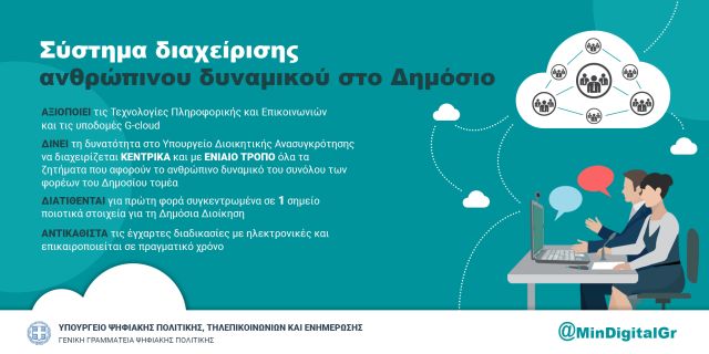 Τα Υπουργεία Ψηφιακής Πολιτικής, Τηλεπικοινωνιών και Ενημέρωσης και Διοικητικής Ανασυγκρότησης συνεργάστηκαν για το σχεδιασμό ενός κομβικού έργου για την αξιοποίηση του ανθρώπινου δυναμικού του ελληνικού Δημοσίου. Πρόκειται για το «Σύστημα Διαχείρισης Ανθρώπινου Δυναμικού (ΣΔΑΔ-HRMS)», προϋπολογισμού 5 εκατ. ευρώ, το οποίο θα χρηματοδοτηθεί από το Επιχειρησιακό Πρόγραμμα «Μεταρρύθμιση Δημοσίου Τομέα».