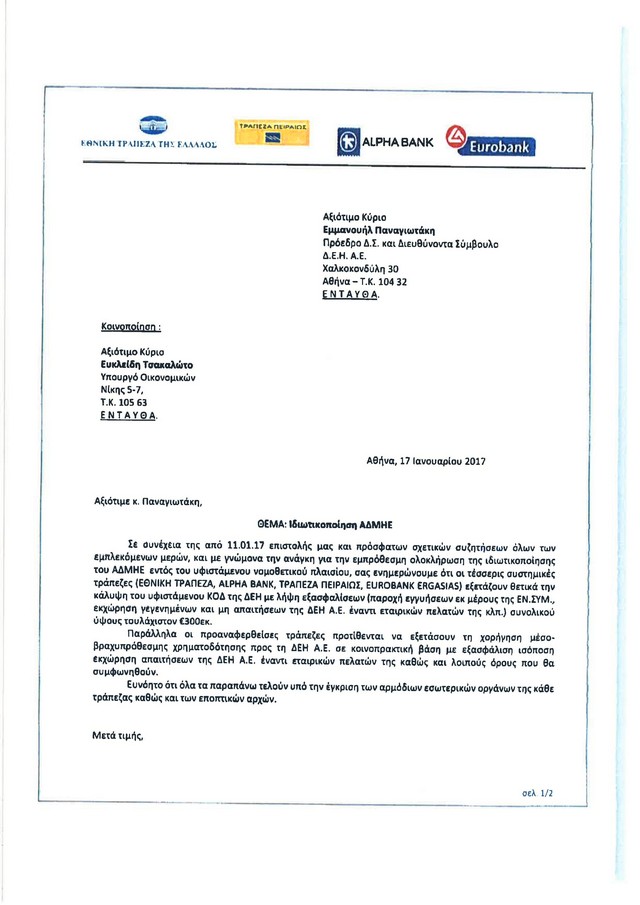 Η Πειραιώς, η Εθνική, η Eurobank και η Alpha έστειλαν την περασμένη εβδομάδα στο υπουργείο Οικονομικών επιστολή με την οποία εξέφραζαν την ανησυχία τους για το σχέδιο απόσχισης, αναφέροντας ότι η διάθεση ενός σημαντικότατου περιουσιακού στοιχείου τη ΔΕΗ άνευ ανταλλάγματος θίγει συμβατικά τους δικαιώματα. Ο υπουργός Οικονομικών Ευκλείδης Τσακαλώτος και ο υπουργός Ενέργειας Γιώργος Σταθάκης συναντήθηκαν με εκπροσώπους των τραπεζών την περασμένη εβδομάδα και συμφώνησαν να ληφθούν συγκεκριμένες ενέργειες για την εμπρόθεσμη ολοκλήρωση του συμφωνημένου σχεδίου για την ιδιωτικοποίηση του ΑΔΜΗΕ, οι οποίες όμως χρειάζονται τεχνική και νομική επεξεργασία.