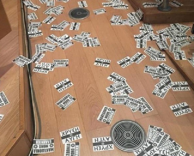 Τα μέλη της Χρυσής Αυγής μπήκαν στην αίθουσα του δημοτικού συμβουλίου, ανήρτησαν πανό το οποίο έγραφε «Μακεδονία γη Ελληνική», πέταξαν τρικάκια και φώναξαν συνθήματα.