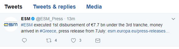 Στην Αθήνα έφτασε το ποσό που αντιστοιχεί στην πρώτη δόση όπως ανακοίνωσε ο ESM. «Ο ESM εκτέλεσε την πρώτη δόση των 7,7 δισ. ευρώ με βάση την τρίτη εκταμίευση, τα χρήματα έφτασαν στην Ελλάδα», σημειώνεται χαρακτηριστικά στον επίσημο λογαριασμό στο twitter.
