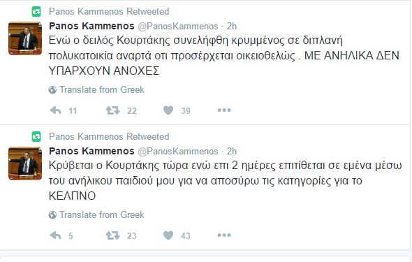 Με ανάρτησή του στο twitter ο κ. Καμμένος αναφέρει «κρύβεται ο Κουρτάκης τώρα ενώ επι 2 ημέρες επιτίθεται σε εμένα μέσω του ανήλικου παιδιού μου για να αποσύρω τις κατηγορίες για το ΚΕΕΛΠΝΟ» και με δεύτερη ανάρτηση, «ενώ ο δειλός Κουρτάκης συνελήφθη κρυμμένος σε διπλανή πολυκατοικία αναρτά οτι προσέρχεται οικειοθελώς. Με ανήλικα δεν υπάρχουν ανοχές».