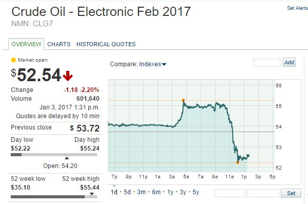 Ενδεικτικά, το αργό πετρέλαιο βρέθηκε σε υψηλά ημέρας στα 55,24 δολ/βαρέλι ενώ το χαμηλό ημέρας σημειώθηκε στα 52,22 δολ.
