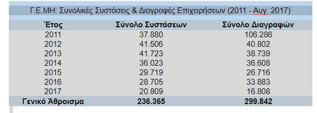 Σύμφωνα με τα παραπάνω στοιχεία, στο Γενικό Εμπορικό Μητρώο κατά το χρονικό διάστημα Ιανουαρίου 2015 έως τον Αύγουστο του 2017 συστάθηκαν 80.745 επιχειρήσεις ενώ διαγράφηκαν 79.596, δημιουργώντας ένα θετικό ισοζύγιο 1.149 νέων επιχειρήσεων ήδη με την ολοκλήρωση του οκταμήνου του 2017. Αντίστοιχα, για την πλήρη τριετία 2011 – 2013 το συνολικό άθροισμα των διαγραφών επιχειρήσεων ήταν 185.827 έναντι 121.109 συστάσεων, ενώ ο τελικός απολογισμός των κυβερνήσεων της Νέας Δημοκρατίας και των συνεργατών της για την περίοδο 2011 - 2014 είναι 222.435 διαγραφές επιχειρήσεων έναντι 175.132 συστάσεων, καταγράφοντας συνολικά αρνητικό ισοζύγιο 64.113 επιχειρήσεων για την περίοδο αναφοράς.