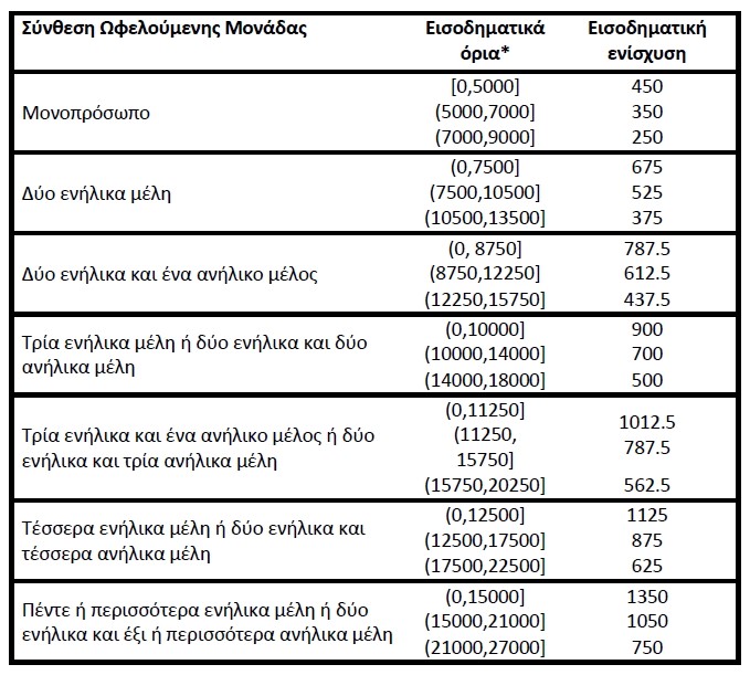Για την καταβολή της εισοδηματικής ενίσχυσης, το ισοδύναμο εισόδημα της ωφελούμενης μονάδας, όπως ορίζεται στο άρθρο 1, δεν πρέπει να υπερβαίνει το ποσό των 9.000 ευρώ. Η ωφελούμενη μονάδα εντάσσεται στην 1η κατηγορία δικαιούχων, εάν το ισοδύναμο εισόδημά της δεν υπερβαίνει το ποσό των 5.000 ευρώ, στη 2η κατηγορία δικαιούχων, εάν το ισοδύναμο εισόδημά της δεν υπερβαίνει το ποσό των 7.000 ευρώ και στην 3η κατηγορία δικαιούχων, εάν το ισοδύναμο εισόδημά της δεν υπερβαίνει το ποσό των 9.000 ευρώ (βλ. Παράρτημα Α').