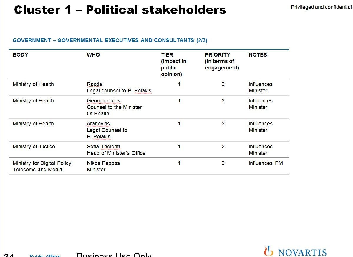 Στην έκθεση καταδεικνύεται πως η φαρμοκοβιομηχανία αμέσως μετά το ξέσπασμα του σκανδάλου προβαίνει σε χαρτογράφηση του πολιτικού προσωπικού σε κομβικά υπουργεία (Υγείας, Οικονομικών, Δικαιοσύνης) όπως επίσης λοιπών κυβερνητικών στελεχών πέριξ του πρωθυπουργού, προέδρους κομμάτων και φορείς που σχετίζονται με το χώρο του φαρμάκου για να εντοπίσει και τους πιθανούς φίλους από τους εχθρούς.