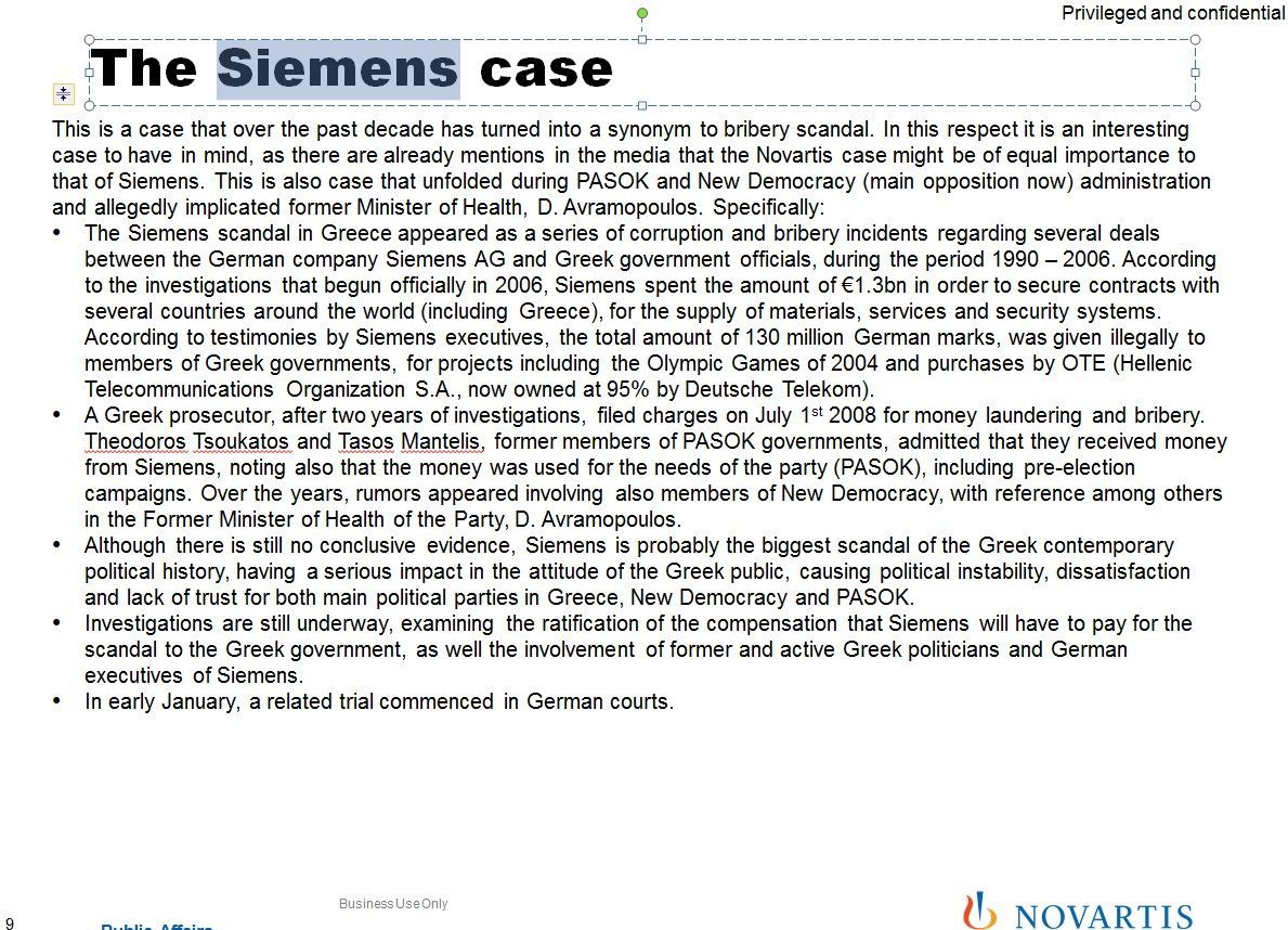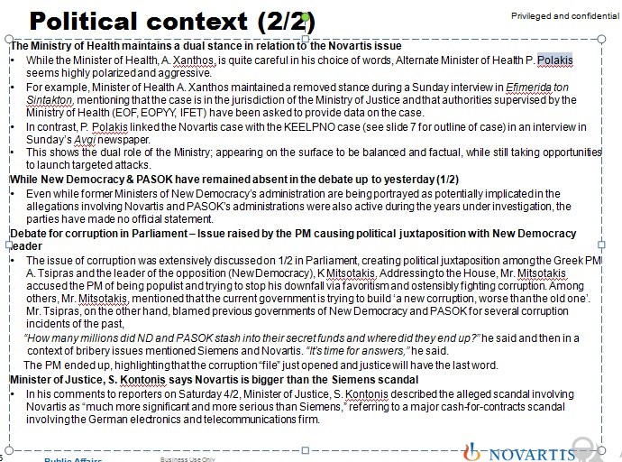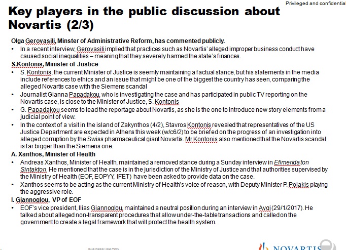 Oπως αναφέρεται σε πολυσέλιδο έγγραφο με ημερομηνία 10 Φεβρουαρίου 2017, το οποίο δίνεται ήδη μεγάλη δημοσιότητα στο σκάνδαλο που εξελίχθηκε επί κυβερνήσεων ΠΑΣΟΚ και ΝΔ και τα ΜΜΕ επισημαίνουν ότι η υπόθεση Novartis μπορεί να είναι «ίσης σημασίας» με αυτή της Siemens.