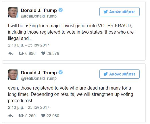 Μεγάλη έρευνα για πιθανή εκλογική νοθεία αναφέρει ότι θα επιδιώξει ο νέος πρόεδρος των ΗΠΑ, Ντόναλντ Τραμπ με σχετική ανάρτηση στο twitter, όπως άλλωστε έχει συνηθίσει...Συγκεκριμένα κάνει λόγο για 2 Πολιτείες για παράνομους ψηφοφόρους, παρά τις πολυπληθείς έρευνες που δείχνουν ότι η εκλογική νοθεία είναι σπάνια στις Ηνωμένες Πολιτείες. "Θα ζητήσω να γίνει μια μεγάλη έρευνα για ΕΚΛΟΓΙΚΗ ΝΟΘΕΙΑ, περιλαμβανομένων των εγγεγραμμένων ψηφοφόρων σε δύο πολιτείες, όσων είναι παράνομοι και ... ακόμα, όσων είναι εγγεγραμμένοι στους εκλογικούς καταλόγους αλλά είναι νεκροί (και πολλοί εδώ και καιρό). Ανάλογα με τα αποτελέσματα θα ενισχύσουμε τις διαδικασίες ψηφοφορίας!" ανέφερε ο Trump σε ανάρτησή του στο Twitter.