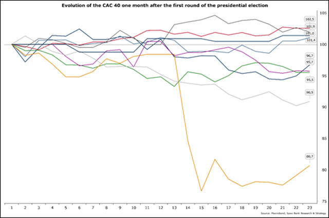 Για τον CAC 40: Είναι αρκετά εύκολο να περιμένει κανείς ότι η γαλλική αγορά μετοχών θα σημειώσει βουτιά μετά από μια νίκη της Μαρί Λε Πεν. Ιστορικά, οι γαλλικές προεδρικές εκλογές έχουν ελάχιστο αντίκτυπο στις χρηματαγορές. Οι μόνες εκλογές στο πλαίσιο της Πέμπτης Δημοκρατίας που είχαν αξιοσημείωτο αντίκτυπο ήταν αυτές του 1981 και οδήγησαν στη νίκη του σοσιαλιστή υποψηφίου Φρανσουά Μιτεράν. Στη διάρκεια των 30 ημερών μετά τον πρώτο γύρο, ο CAC 40 υποχώρησε σχεδόν κατά 20%, καθώς οι επενδυτές φοβόντουσαν ότι «τα Σοβιετικά τανκ θα έκαναν παρέλαση στη Σανζ Ελιζέ». Μια ανάλογη ανατροπή είναι πιθανή σε περίπτωση νίκης του Εθνικού μετώπου, τουλάχιστον μέχρι οι ξένοι επενδυτές να συνειδητοποιήσουν ότι η νέα πρόεδρος είναι ανίσχυρη.