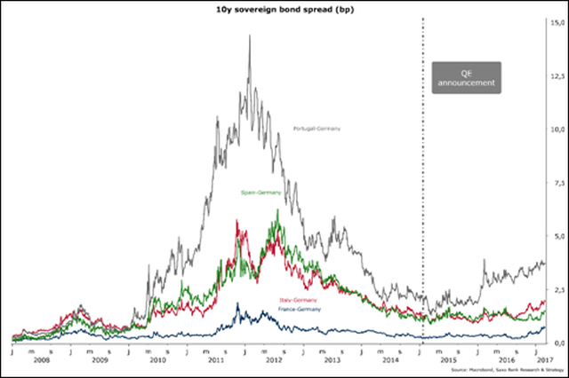 Για τα κόστη δανεισμού και τη δημοσιονομική βιωσιμότητα της Γαλλίας: Ο βασικός φόβος των ξένων επενδυτών είναι μια μεγάλη αύξηση στα επιτόκια λόγω πολιτικού κινδύνου. Το 2007, οι τόκοι πληρωμής της Γαλλίας (που αποτελούν τον δεύτερο σημαντικότερο παράγοντα εξόδων του κράτους) αντιπροσώπευαν το 2,5% του ΑΕΠ και το 2016 μόλις το 1,7%, λόγω της μείωσης των επιτοκίων – και παρά τη σημαντική αύξηση του δημόσιου χρέους. Οι τόκοι πληρωμής της Γαλλίας ως ποσοστό του ΑΕΠ είναι χαμηλότεροι από ό,τι στα περισσότερα άλλα ευρωπαϊκά κράτη (Ηνωμένο Βασίλειο, Ιταλία, Ισπανία), με εξαίρεση τη Γερμανία. Λόγω της μακρόχρονης διάρκειας του γαλλικού χρέους (7 χρόνια) μια μεταβολή των επιτοκίων κατά 1% έχει ετήσιο αντίκτυπο ύψους μόλις 0,14% στις καταβολές τόκων. Ακόμα και στην περίπτωση άλματος των επιτοκίων, οι τόκοι πληρωμής αναμένεται να παραμείνουν πτωτικοί το 2017 και το 2018 (φθάνοντας περίπου στο 1,5% του ΑΕΠ) λόγω της αποπληρωμής χρεών που έχουν ήδη εκδοθεί από την εποχή της χρηματοπιστωτικής κρίσης του 2007. Σύμφωνα με την υπόθεση ότι η απόδοση του 10ετούς γαλλικού κρατικού ομολόγου είναι 4%, ο ετήσιος πληθωρισμός 2% και η ετήσια ανάπτυξη του ΑΕΠ 1%, και εφόσον οι υπόλοιποι παράγοντες παραμείνουν σταθεροί, οι καταβολές των τόκων θα φθάσουν στα επίπεδα του 2012 μόλις στις αρχές της δεκαετίας του 2020. Επομένως, η επίδραση μιας ανόδου των επιτοκίων λόγω του «φαινομένου Λε Πεν» (που δεν είναι πιθανό να διαρκέσει) ή λόγω εξωτερικών παραγόντων όπως μια συνολική αύξηση του πληθωρισμού, δεν αναμένεται να έχει σημαντικό αντίκτυπο στα δημόσια οικονομικά για το μεγαλύτερο διάστημα της επόμενης προεδρικής θητείας.
