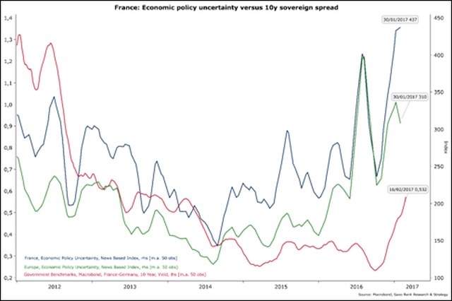 Οι επικείμενες γαλλικές προεδρικές εκλογές προκαλούν κύματα κρύου ιδρώτα στους επενδυτές σε ολόκληρο τον κόσμο. Μετά το πρόσφατο παράδειγμα των ΗΠΑ, όλοι φοβούνται μια έκπληξη της τελευταίας στιγμής που θα μπορούσε να θέσει έναν λαϊκιστή πολιτικό επικεφαλής της πέμπτης οικονομικής δύναμης παγκοσμίως. Για την ακρίβεια, η Μαρί Λε Πεν προηγείται σημαντικά στις δημοσκοπήσεις. Τις τελευταίες εβδομάδες εκμεταλλεύτηκε το σκάνδαλο «Penelopegate» και τον θυμό που κυριαρχεί στα πλέον υποβαθμισμένα προάστια της Γαλλίας προς όφελός της.