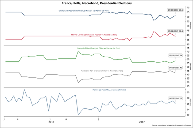 Στον πρώτο γύρο ενδέχεται να εξασφαλίσει περίπου το 27% των ψήφων, σημαντικά υψηλότερο ποσοστό από τους υπόλοιπους υποψήφιους. Στον δεύτερο γύρο, πρόσφατη δημοσκόπηση της δίνει άνω του 40% των ψήφων (43% έναντι του Φρανσουά Φιγιόν και 42% έναντι του Εμανουέλ Μακρόν), όταν λίγες εβδομάδες νωρίτερα το ίδιο ποσοστό κυμαινόταν πολύ χαμηλότερα (περίπου στο 35% των ψήφων). Η δημοσίευση μιας νέας δημοσκόπησης σε καθημερινή σχεδόν βάση αποτελεί μακρόχρονη γαλλική παράδοση. Επομένως αυτή η ανοδική τάση πρέπει να επιβεβαιωθεί από τις επόμενες δημοσκοπήσεις. Ωστόσο, είναι μάλλον ήδη φανερό ότι η προεδρική κούρσα αρχίζει να κρίνεται και ότι το Εθνικό Μέτωπο δεν βρέθηκε ποτέ πιο κοντά στην εξουσία – γεγονός που από μόνο του αρκεί για να προκαλέσει πανικό στους επενδυτές.