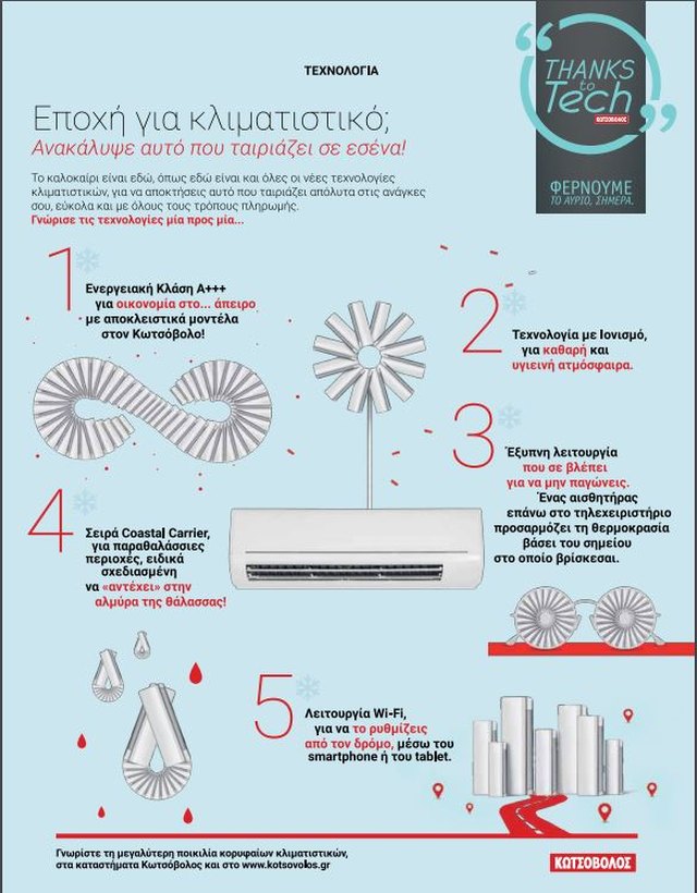Η αγορά ενός νέου κλιματιστικού inverter με αναβαθμισμένη ενεργειακή κλάση αποτελεί μία συμφέρουσα αγορά για ένα νοικοκυριό, καθώς η νέα συσκευή μπορεί να αποπληρώνεται μέσω της εξοικονόμησης στο λογαριασμό του ρεύματος. Στο δίκτυο καταστημάτων της Κωτσόβολος, οι καταναλωτές μπορούν να αναζητήσουν τη λύση που τους ταιριάζει, μέσα από τη μεγαλύτερη ποικιλία κλιματιστικών, καθώς η εταιρεία διαθέτει 13 μάρκες κλιματιστικών: Toyotomi, Toshiba, Mitsubishi, Daikin, Fujitsu, Kerosun Clima, Midea, Juro Pro, Pitsos, Panasonic, Nakassi, ενώ υπάρχει αποκλειστική συνεργασία στα προϊόντα κλιματιστικών Samsung και Carrier.