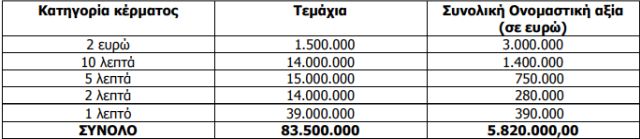 Πρόκειται για την κοπή 83.500.000 κερμάτων των 2 ευρώ, των 10 λεπτών, των πέντε λεπτών, των 2 λεπτών και του ενός λεπτού.