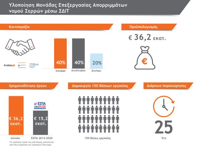 Αντικείμενο της Σύμπραξης είναι η μελέτη, χρηματοδότηση, κατασκευή, συντήρηση και λειτουργία των υποδομών της Μονάδας Επεξεργασίας Απορριμμάτων του Νομού Σερρών. Η ανάδοχος Ανώνυμη Εταιρεία Ειδικού Σκοπού αποτελείται από τις εταιρείες Intrakat (40%), Archirodon (40%), Envitec (20%). Φορέας Υλοποίησης και Αναθέτουσα Αρχή είναι ο Περιφερειακός Σύνδεσμος Φορέων Διαχείρισης Στερεών Αποβλήτων Κεντρικής Μακεδονίας.