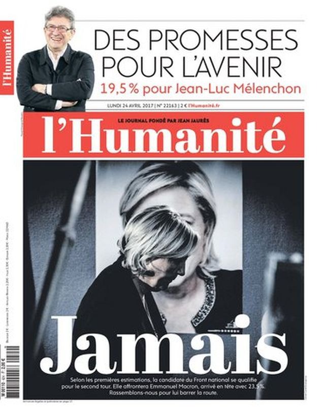Με μια εκφραστική φωτογραφία της ακροδεξιάς ηγέτιδος και υπό τον τίτλο «Jamais» («Ποτέ») η L’ Humanite απευθύνεται στους δημοκρατικούς ψηφοφόρους της Γαλλίας ενόψει του β’ γύρου των προεδρικών εκλογών την ερχόμενη Κυριακή 7 Μαΐου.