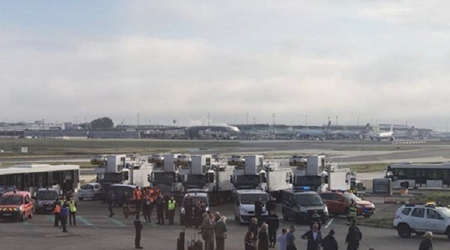 Αστυνομικοί και οχήματα της πυροσβεστικής περικύκλωσαν το αεροσκάφος που επρόκειτο να απογειωθεί στις 7:25 το πρωί του Παρισιού με προορισμό το Λονδίνο.