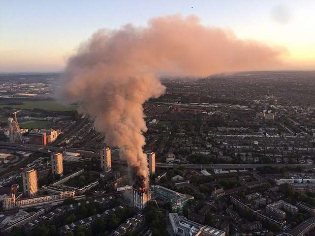 Η φωτιά έχει επεκταθεί από τους κάτω ορόφους προς τα επάνω και κατακαίει τον πύργο, ενώ μία στήλη μαύρη καπνού είναι διακριτή στον ουρανό του Λονδίνου. Το κτίριο δεν κινδυνεύει με κατάρρευση.