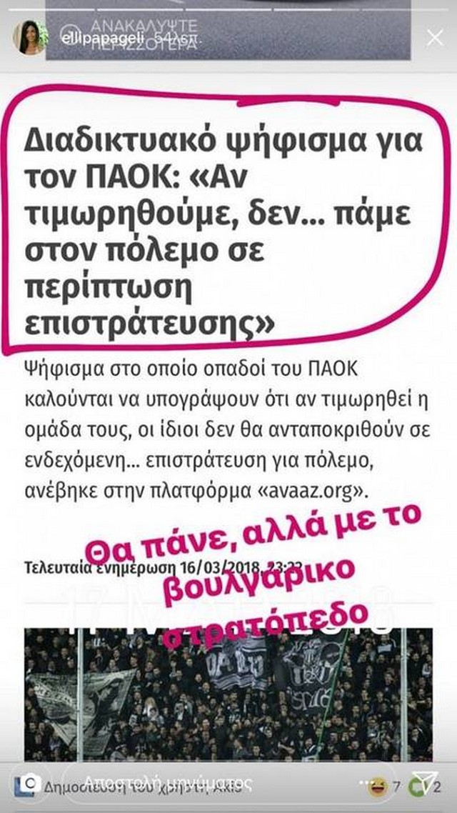 H Έλλη Παπαγγελή εξοργίστηκε από το άνωθεν και ανήρτησε στις 16 Μαρτίου, στο Instagram, φωτογραφία του εν λόγω ψηφίσματος, όπου σχολίασε πως «θα πάνε, αλλά με το βουλγαρικό στρατόπεδο».