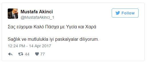 Εν μέσω των έντονων παρασκηνιακών και διπλωματικών διεργασιών για το Κυπριακό ο Τουρκοκύπριος ηγέτης, Μουσταφά θέλησε να ευχηθεί σε Έλληνες και Κυπρίους: Με ανάρτηση στον προσωπικό του λογαριασμό στο Τwitter, ο Τουρκοκύπριος ηγέτης Μουσταφά Ακιντζί ευχήθηκε «Καλό Πάσχα με Υγεία και Χαρά», στα... ελληνικά!