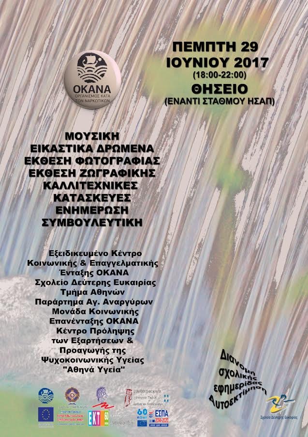 Την Πέμπτη, 29 Ιουνίου και ώρα 18:00 – 22:00 στο Θησείο (έξω από τον Σταθμό ΗΣΑΠ) στελέχη από το Σχολείο Δεύτερης Ευκαιρίας-Τμήμα Αθηνών, Παράρτημα Αγ. Αναργύρων, του Εξειδικευμένου Κέντρου Κοινωνικής και Επαγγελματικής Ένταξης ΟΚΑΝΑ (ΕΚΚΕΕ), της Μονάδας Κοινωνικής Επανένταξης ΟΚΑΝΑ και του Κέντρου Πρόληψης των Εξαρτήσεων & Προαγωγής της Ψυχοκοινωνικής Υγείας Δήμου Αθηναίων «Αθηνά-Υγεία» ενημερώνουν, προβάλλουν, εκθέτουν: