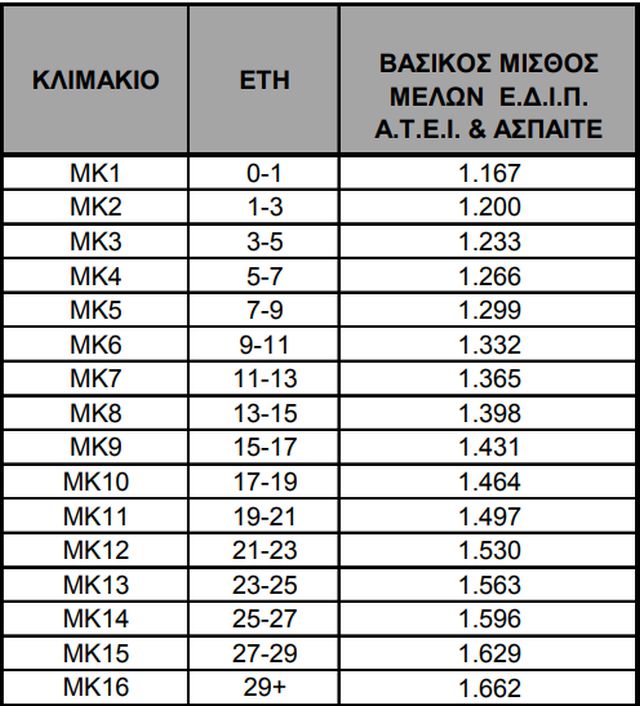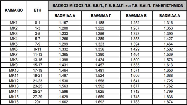 Ο μηνιαίος βασικός μισθός του Εργαστηριακού Διδακτικού Προσωπικού (Ε.ΔΙ.Π.) των Πανεπιστημίων διαμορφώνεται σε ποσοστό επί του αντίστοιχου Μ.Κ. του Καθηγητή Πανεπιστημίου, ως εξής: