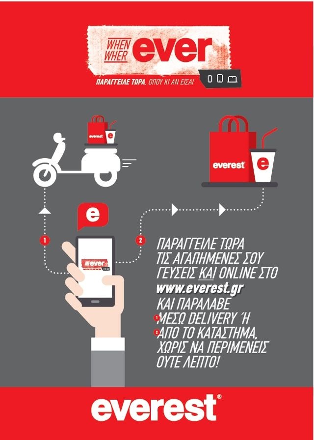 Ο νέος online τρόπος παραγγελίας στα everest, σηματοδοτεί μια νέα εποχή εξυπηρέτησης, αναβαθμισμένης εμπειρίας αλλά και προσωποποιημένης επικοινωνίας. Οι πελάτες των everest θα λαμβάνουν εξατομικευμένη ενημέρωση μέσω SMS, newsletters & push notifications με τα νέα των everest αλλά & προσφορές που αφορούν τις προσωπικές τους προτιμήσεις και ανάγκες. Τα everest με επίκεντρο τον καταναλωτή εξελίσσονται διαρκώς και δημιουργούν προτάσεις που βελτιώνουν την εμπειρία του καταναλωτή και ανταποκρίνονται στο διαρκώς μεταβαλλόμενο τρόπο ζωής του.