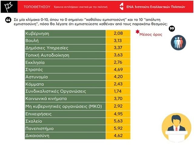Ειδικότερα οι πολίτες, όταν καλούνται να δηλώσουν την εμπιστοσύνη τους (κλίμακα 0-10) σε θεσμούς, οι συνδικαλιστικές οργανώσεις (1,74), η κυβέρνηση (2,08), τα κόμματα (2,43), αλλά και η Βουλή (3,13) εμφανίζονται ως ουραγοί.