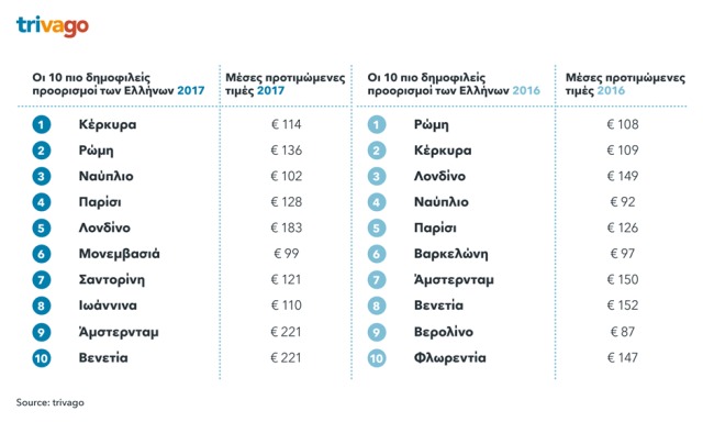 Αυξήθηκαν χαρακτηριστικά οι μέσες προτιμώμενες τιμές σε πολλούς προορισμούς σε σχέση με τις αντίστοιχες του 2016. Η μεγαλύτερη αύξηση παρατηρήθηκε στη Ρώμη όπου φέτος η μέση προτιμώμενη τιμή αυξήθηκε κατά 26% σε σχέση με την περσινή των 108 ευρώ και διαμορφώθηκε στα 136 ευρώ. Στο Λονδίνο, η τιμή αυξήθηκε κατά 23 τοις εκατό, από τα 149 ευρώ στα 183 ευρώ, ενώ στο Ναύπλιο παρατηρήθηκε μικρότερο ποσοστό αύξησης της τάξεως του 11 τοις εκατό. Πιο συγκεκριμένα, η μέση προτιμώμενη τιμή από τα 92 ευρώ που ήταν, ανήλθε στα 102 ευρώ. Στην Κέρκυρα, η τιμή διαμορφώθηκε στα 114 ευρώ, από 109 που ήταν το 2016, ενώ στο Παρίσι η μέση προτιμώμενη τιμή ήταν 128 ευρώ, κατά 2 τοις εκατό αυξημένη σε σχέση με την περσινή.