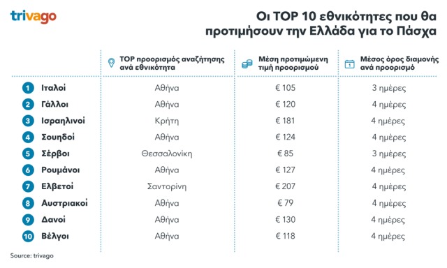 Η Αθήνα είναι ο ελληνικός προορισμός που θα προτιμηθεί κατά κόρων από τους ξένους τουρίστες το φετινό Πάσχα, με επτά από τις top δέκα εθνικότητες που θα επισκεφτούν φέτος την χώρα μας να προτιμούν την πρωτεύουσα. Πιο συγκεκριμένα, η Αθήνα προτιμήθηκε από τους Ιταλούς και τους Γάλλους, που βρίσκονται στις δύο πρώτες θέσεις της λίστας, ακολουθούμενοι από τους Σουηδούς στην τέταρτη, τους Ρουμάνους στην έκτη, τους Αυστριακούς στην όγδοη, και τους Βέλγους στην δέκατη. Την μεγαλύτερη μέση προτιμώμενη τιμή για την Αθήνα είχαν οι Δανοί, στα 130 ευρώ, οι οποίοι βρίσκονται στην ένατη θέση της σχετικής λίστας. Οι Ισραηλινοί προτίμησαν την Κρήτη, με την μέση προτιμώμενη τιμή να είναι 181 ευρώ, ενώ οι Ελβετοί προτίμησαν την Σαντορίνη, με την μέση προτιμώμενη τιμή να διαμορφώνεται στα 207 ευρώ. Τέλος οι Σέρβοι, οι οποίοι βρίσκονται στην πέμπτη θέση της λίστας προτίμησαν την Θεσσαλονίκη.