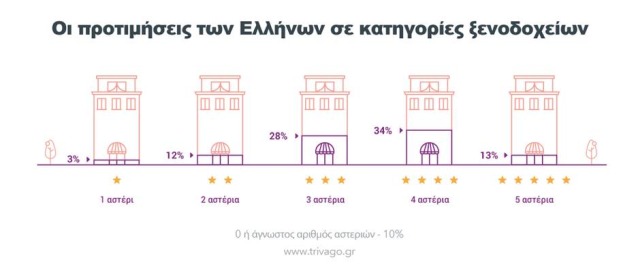 Όσον αφορά στις προτιμήσεις των Ελλήνων σε κατηγορίες ξενοδοχείων, τα τεσσάρων αστέρων είχαν την τιμητική τους, αγγίζοντας το 34% του όγκου των αναζητήσεων, ακολουθούμενα από αυτά των τριών, με 28%. Τα ξενοδοχεία πέντε αστέρων ήταν τρίτα στις προτιμήσεις των Ελλήνων χρηστών συγκεντρώνοντας το 13% των αναζητήσεων.