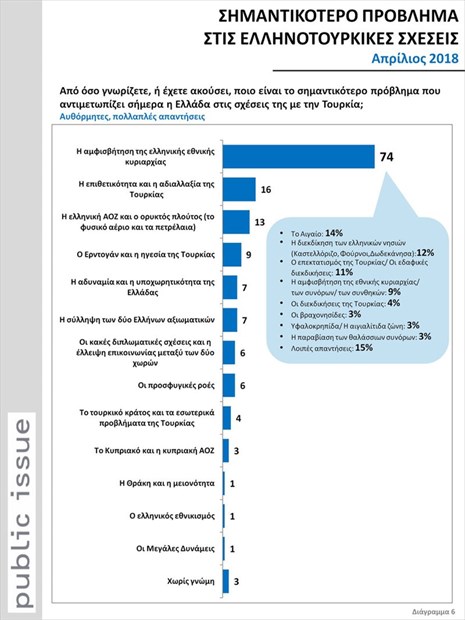 Συγκεκριμένα το 74% των ερωτηθέντων απάντησε ότι η αμφισβήτηση της εθνικής κυριαρχίας είναι το σημαντικότερο πρόβλημα, ενώ το 16% εκτιμά ότι το σημαντικότερο πρόβλημα είναι η επιθετικότητα και η αδιαλλαξία της Τουρκίας.