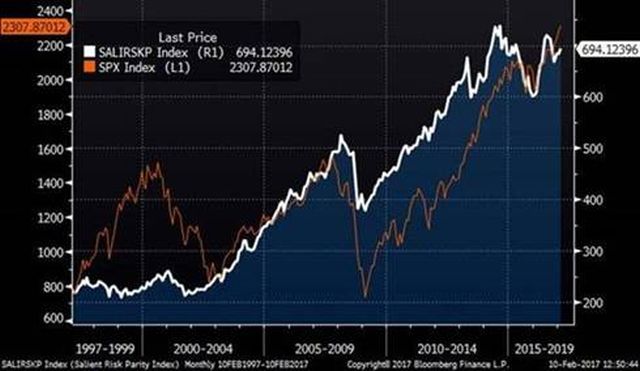 Στη συνέχεια αυτό εξισορροπείται σε ετήσια βάση πίσω στο 25% – η μοντέρνα εκδοχή είναι το risk parity. Το ακόλουθο διάγραμμα παρουσιάζει το risk parity έναντι του S&P 500. Πράγματι, οι αποδόσεις είναι οι ίδιες, με σημαντικά μικρότερη μεταβλητότητα.