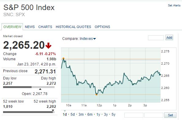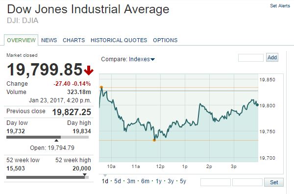 Εμφανές ήταν το κλίμα νευρικότητας στην πρώτη συνεδρίαση της εβδομαδάς στην Wall Street στον απόηχο της ανάληψης της προεδρίας των ΗΠΑ από τον Ντόναλντ Τραμπ. Ο νέος πρόεδρος από την πρώτη στιγμή κινείται με τον γνώριμο εκρηκτικό του λόγο γεγονός που δημιουργεί αβεβαιότητα για το επόμενο διάστημα. Στις πρώτες κινήσεις του ο Τραμπ υπογράφει εκτελεστική εντολή με την οποία ανακοινώνει την πρόθεσή του να αποχωρήσει από την Trans-Pacific Partnership (TPP), μια εμπορική συμφωνία μεταξύ των ΗΠΑ και 11 άλλων χωρών της περιοχής του ειρηνικού.
