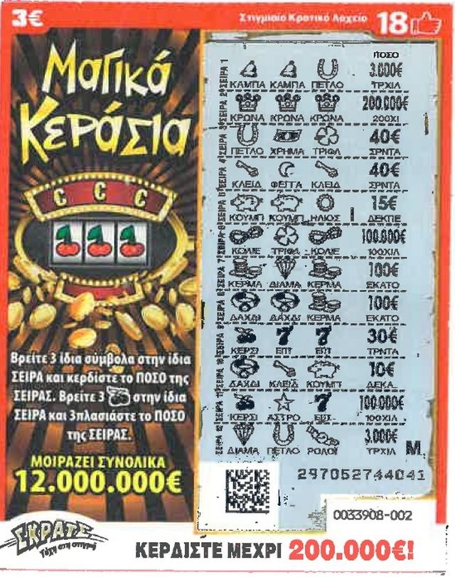 Το μέγιστο έπαθλο των 200.000 ευρώ πέτυχε μια νικήτρια στα «Μαγικά Κεράσια» του ΣΚΡΑΤΣ. Η τυχερή παίκτρια ξεκίνησε να σκρατσάρει το δελτίο της από τη δεύτερη γραμμή, όπου κρύβονταν τα τρία ίδια σύμβολα, και όταν είδε ότι κέρδισε δεν πίστευε στα μάτια της.