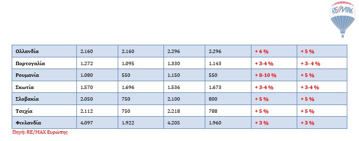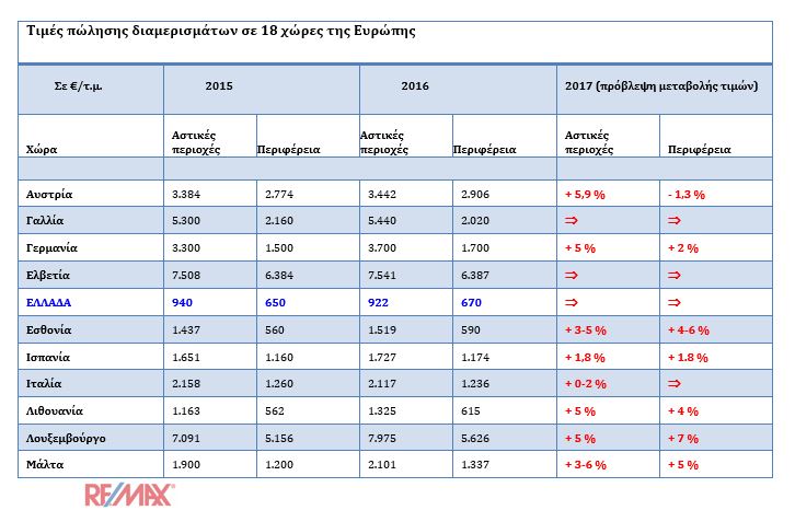Ενδεικτικά αναφέρεται ότι οι τιμές ανά τετραγωνικό μέτρο αυξήθηκαν σημαντικά για τα αστικά διαμερίσματα σε περιπτώσεις χωρών όπως η Λιθουανία, η Γερμανία και το Λουξεμβούργο (της τάξεως του 13%), ενώ οι τιμές πώλησης των οικιστικών ακινήτων (διαμερισμάτων) αυξήθηκαν επίσης και στην περιφέρεια και αναμένεται να αυξηθούν περαιτέρω το 2017 κατά περίπου 7% στο Λουξεμβούργο και 4-6% στην Εσθονία. Ωστόσο, σε χώρες όπως η Γαλλία, η Ελβετία και η Ιταλία οι τιμές προβλέπεται να παραμείνουν σταθερές για το 2017. Στην ίδια κατηγορία εντάσσεται και η Ελλάδα, η οποία μαζί με την Πορτογαλία και την Σκωτία μετά από μια περίοδο μακράς ύφεσης δείχνουν σημάδια ανάκαμψης και αυξανόμενης τάσης σταθερότητας, με ελπίδα για ακόμα καλύτερες προοπτικές στο άμεσο μέλλον.