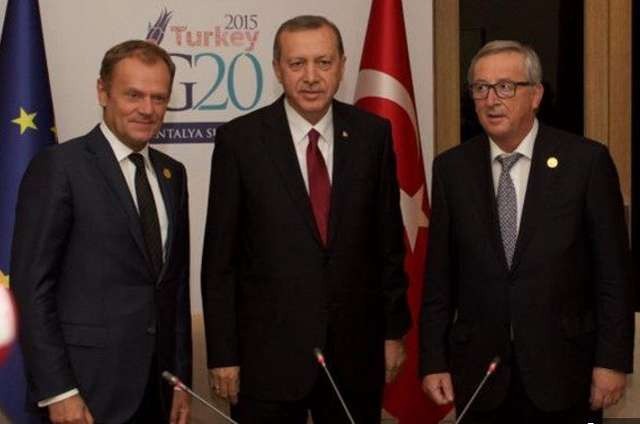 Ο τούρκος πρόεδρος, Ρετζέπ Ταγίπ Ερντογάν, έγινε σήμερα δεκτός στις Βρυξέλλες από τους προέδρους του Ευρωπαϊκού Συμβουλίου και της Επιτροπής Ντόναλντ Τουσκ και Ζαν-Κλοντ Γιούνκερ, με φόντο ισχυρές εντάσεις ανάμεσα στις Βρυξέλλες και την Άγκυρα.