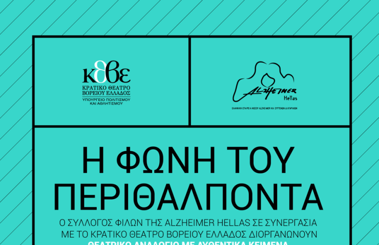 Ο Σύλλογος Φίλων της Alzheimer Hellas σε συνεργασία με το Κρατικό Θέατρο Βορείου Ελλάδος διοργανώνουν την Τρίτη 21/03 στις 18:30 στο κινηματοθέατρο «Αλέξανδρος» (Εθνικής Αμύνης 1) θεατρικό αναλόγιο με αυθεντικά κείμενα περιθαλπόντων ατόμων με άνοια. Μια παγκόσμια πρωτοτυπία που θα παρουσιαστεί για πρώτη φορά στη Θεσσαλονίκη με την υποστήριξη του Κέντρου Πολιτισμού της Περιφέρειας Κεντρικής Μακεδονίας!