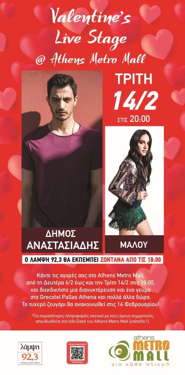 Ο έρωτας φέτος σας δίνει ραντεβού στο ATHENS METRO MALL! Πέντε μόλις λεπτά από το κέντρο της Αθήνας, το αγαπημένο εμπορικό κέντρο των Νοτίων Προαστίων σας περιμένει στις 14 Φεβρουαρίου με ένα ανεπανάληπτα ρομαντικό Valentine’s Live stage. Στη σκηνή θα τραγουδήσουν ζωντανά ο Δήμος Αναστασιάδης και η Μαλού τα αγαπημένα τους τραγούδια, αφιερωμένα στην Ημέρα των Ερωτευμένων.