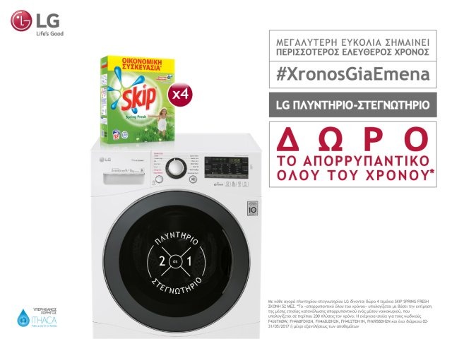 Ανταμείβοντας τους καταναλωτές για την επιλογή τους, η LG Electronics (LG) με κάθε αγορά LG πλυντηρίου-στεγνωτηρίου προσφέρει δώρο το απορρυπαντικό όλου του χρόνου, 4 τεμάχια SKIP SPRING FRESH σκόνη 52 μεζούρες. Στην προωθητική ενέργεια συμμετέχουν οι κωδικοί F4J6TM0W, FH4A8FDH2N, FH4A8JDH2N, FH4U2TDH1N, FH695BDH2N, FH4U1JBH6N, FH6G1BCH2N.